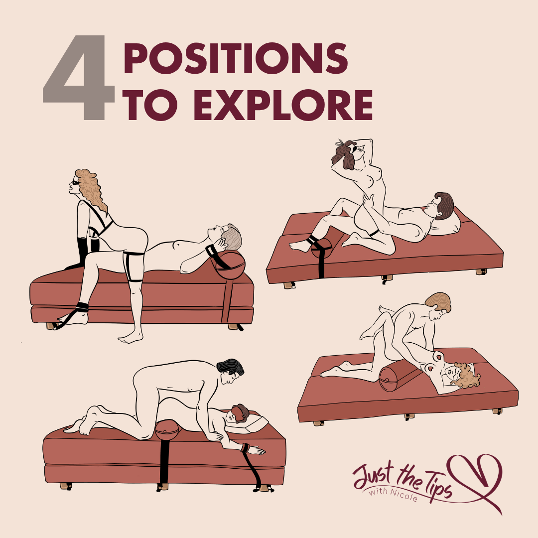 - Convertible Pleasure Platform – Folds out from a daybed (80” x 30”) to a queen-size platform (80” x 60”) for expanded play