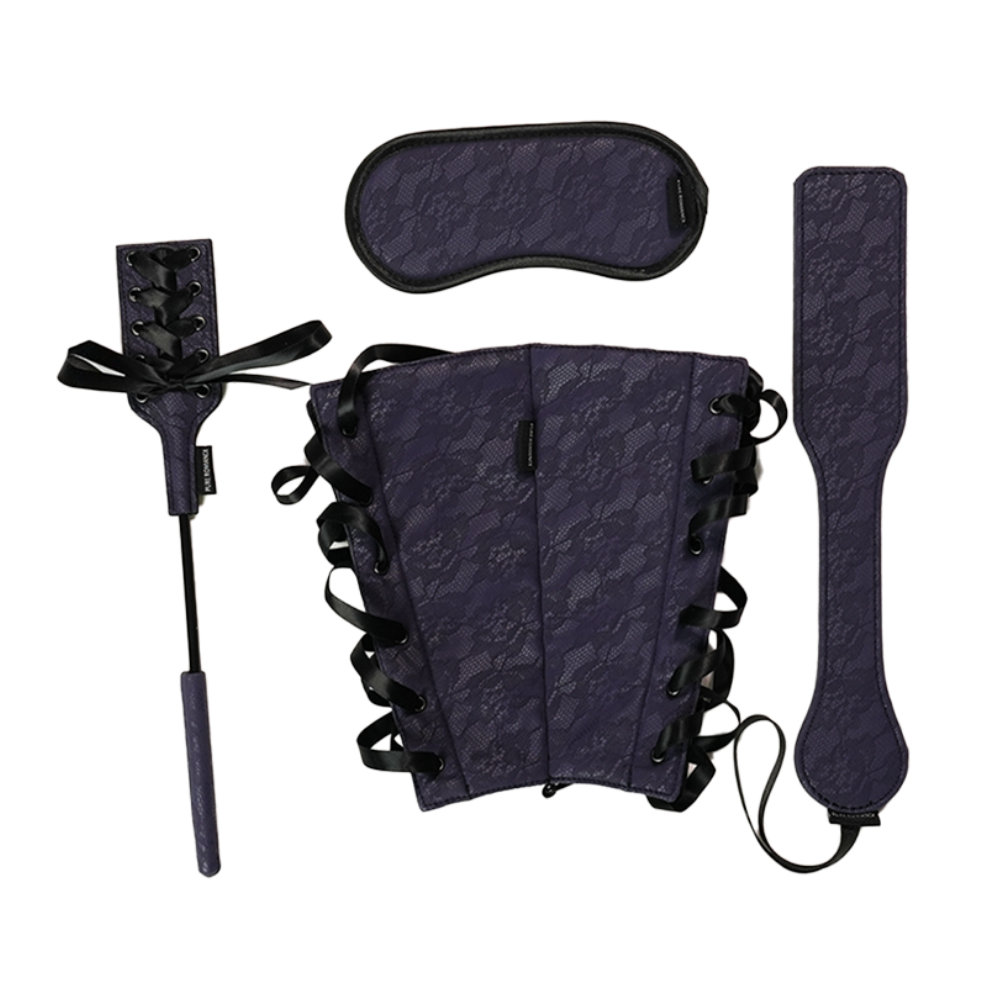 Delve into a whole new world with a luxe, four-part set featuring a blindfold, paddle, crop, and arm restraints. The paddle and crop take painful pleasure experiments to mastery, the blindfold removes sight to spotlight sensation, and the arm restraints bind for sultry submission. Satin accents and plush, lace-print material add a touch of softness to contrast the bold intensity of play. Try each accessory one by one and make it a slow descent into all things erotic, or pair off parts of the set for multi-faceted satisfaction that exceeds expectations time and time again