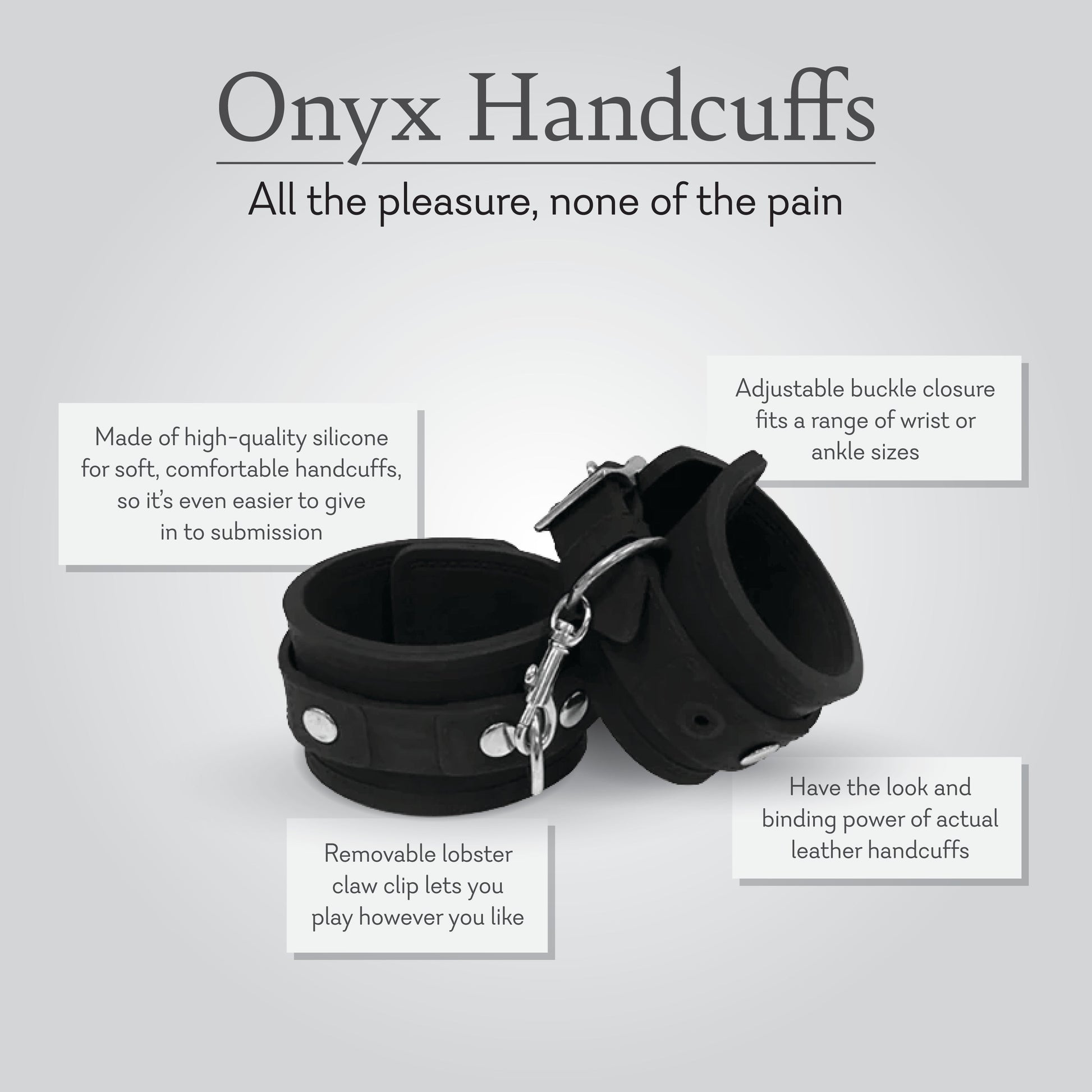 Get all of the pleasure and none of the pain with these soft silicone Onyx Handcuffs. Designed with a supple and smooth silicone, these handcuffs give the look and binding power of traditional leather cuffs and eliminate any unwanted discomfort from tough leather. The buckle closure makes it easy to fit wrists of all sizes. Metal loops let you play however you like, and a removable lobster clasp provides varying levels of restraint. Take control—or give in to control—with the Onyx Handcuffs tonight.